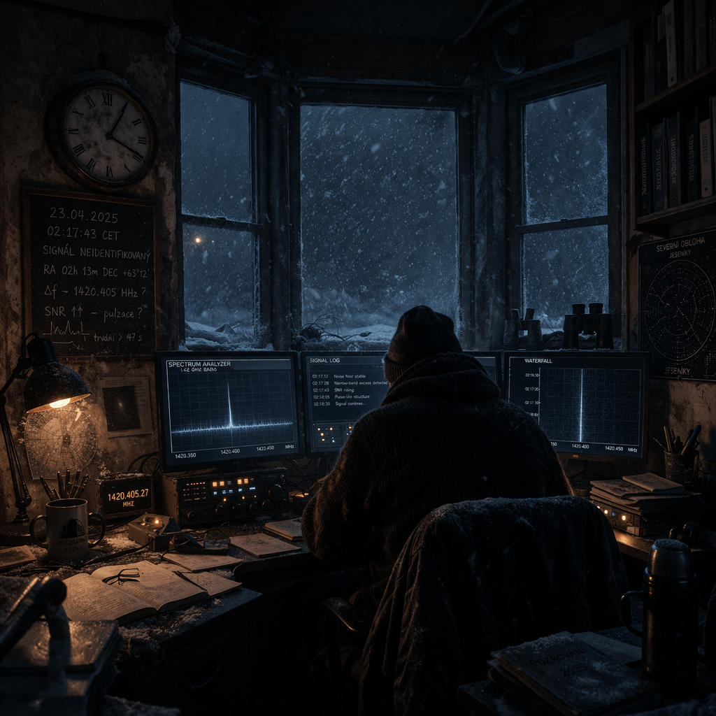 Příběh se odehrává v observatoři, někde uprostřed Jeseníků. Astronom zachytí signál totožný se signálem objeveným v roce 1977. Rozhodne se objev neoznámit a prozkoumat.